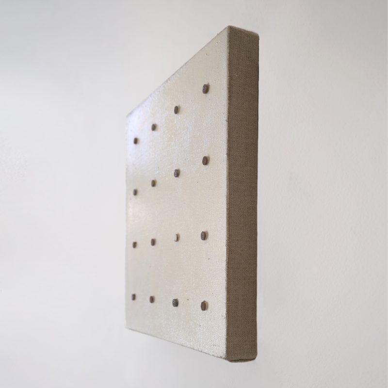 E poi ci sono i dots. I puntini metodici, ordinati, cuciti o dipinti su tela. E qui entra in scena il fantasma di Damien Hirst e dei suoi famosi “spot paintings”. Hirst li ha moltiplicati all’infinito, fino a svuotarli di senso. Staton li riprende, ma li riempie di nuovo. I suoi punti non sono piatti, non sono riproducibili all’infinito come un catalogo Ikea: sono materia, tessuto, corpo.