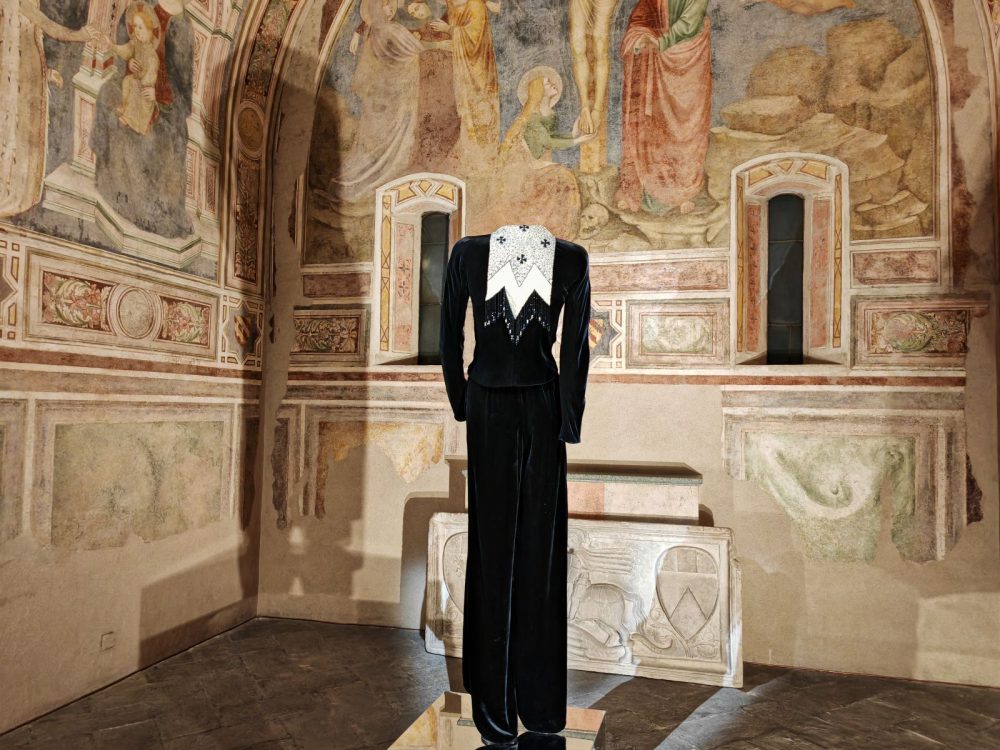 I manichini invisibili lasciano che siano i capi stessi a evocare i corpi, restituendo la forza della visione armaniana. Come nel caso di un abito blu, voluto espressamente da Re Giorgio in dialogo con una Madonna con Bambino di Giovanni Bellini. In questo allestimento, moda e pittura dialogano in un gioco di contrasti cromatici e materici, invitando il visitatore a scoprire affinità e differenze tra linguaggi creativi solo apparentemente distanti.