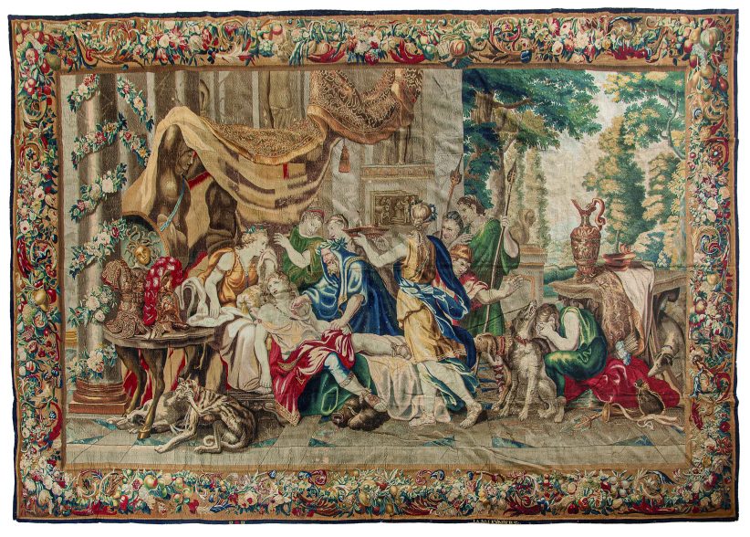Tra i pezzi più significativi spiccano due arazzi di eccezionale pregio, entrambi risalenti alla fine del XVII secolo. Il primo, tessuto a Bruxelles nell’atelier di Jan Leyniers, raffigura la Morte di Meleagro ed è ispirato ai cartoni di Charles Le Brun. Il secondo proviene dalla celebre manifattura reale dei Gobelins di Parigi e appartiene alla serie dei Dodici Mesi, rappresentazione allegorica del ciclo delle stagioni.
