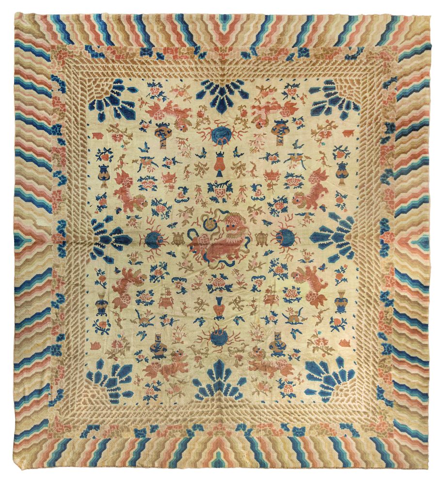 Notevole anche la sezione dedicata ai tappeti. Tra gli highlight, un frammento di tappeto da triclinium proveniente da Kerman (Persia, circa 1880), composto originariamente da quattro elementi disposti secondo una rigida architettura funzionale. La rarità tipologica del formato ne aumenta il valore, anche in presenza di una struttura incompleta. Da segnalare anche un tappeto cinese del XIV secolo con nove cani di Foo su fondo crema e un grande tappeto turco da preghiera, inusuale per dimensioni.