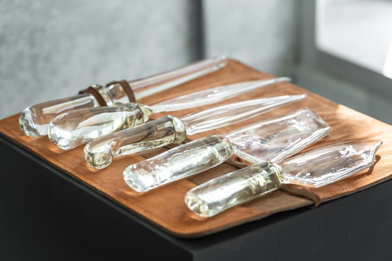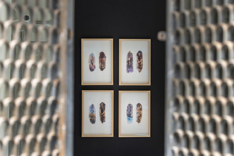 Lo spazio della 10 & zero uno è un’ex macelleria, e già questo bastava a creare suggestione: piastrelle bianche come un acquario svuotato, il ricordo di carcasse appese e coltelli affilati, ora sostituiti da lame di vetro di Murano. Una volta servivano a tagliare. Adesso brillano sotto le luci come reliquie, e la gente le guarda con rispetto e un filo di paura. C’è chi pensa all’artigianato, chi al turismo che ha trasformato Venezia in una Disneyland, chi al gesto antico del macellaio che qui dentro passava le sue giornate. Poi, poco più in là, le piume. Piume vere, leggere, come prese da un cuscino o da una maschera di carnevale. Sala le usa da tempo, e qui diventano il contrappunto fragile alle gondole, ai palazzi, alle cartoline infinite che raccontano Venezia al mondo. Basta poco per capirlo: la leggerezza non è libertà, è piuttosto un promemoria che questa città rischia di svanire in silenzio, senza rumore.