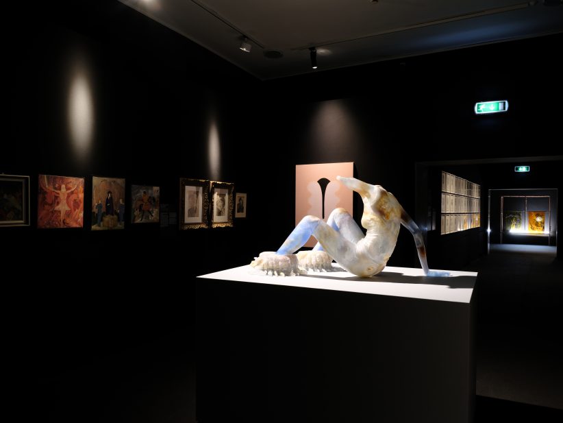 E in questo quasi atlante dell’invisibile non potevano mancare le opere di Carol Rama (1918-2015), artista torinese impossibile da etichettare, la cui opera provocatoria e conflittuale ha sfidato le norme sociali nel corso di tutta la sua vita, che nel 2003 ha ricevuto il Leone d’Oro alla carriera alla Biennale di Venezia. La sala di richiamo mediatico più che medianico, è quella dedicata alla pioniera dell’astrattismo Hilma af Klint (1862-1944), artista mistica svedese oggi riconosciuta come pioniera dell’astrazione, autrice di lavori non figurativi in anticipo rispetto a quelli di Kandinskij, a cui dopo la grande mostra a Basilea, seguirà quella alla National Gallery of Ireland a Dublino in programma nel 2026, una esposizione incentrata sulla sua esplorazione dell’occulto attraverso sedute spiritiche, scrittura e disegno automatici dell’artista più richiesta del momento. Tra gli altri cultori dell’invisibile in mostra troviamo 13 artisti contemporanei, in cui la scultura è protagonista tra oggetti d’arredo antichi, cineserie, ritratti e la bellissima raccolta di vedutismo dedicata a Milano del Settecento, e in questo scenario piacciono le strambe creature di Kiki Smith (1954), disseminate al piano nobile, dove si respira una certa suspense, con il calco iperrealista abbandonato su un tappeto prezioso di Jill Mulleady (1980). Ma bando agli elenchi sterili, anche perché avrete già letto di tutto e di più su questa imperdibile mostra, si consiglia di vederla senza attese e pregiudizi. Quindi prendetevi tempo e dedicatevi all’arte del guardare, passeggiate tra le sale per capire come le arti visive indagano le contaminazioni tra misticismo, esoterismo, teosofia e pratiche simboliche dall’alba dei tempi, con il fine di scardinare convenzioni consolidate, ridefinendo il ruolo dell’arte nella società di ieri e di oggi. Semmai tornateci più volte, tanto la mostra è a entrata libera fino al 30 novembre, come tutte le altre ideate dalla Fondazione Trussardi, una istituzione no profit, diciamo un “museo nomade” che produce la diffusione dell’arte contemporanea in contesti diversi e propone mostre in rapporto alla città, alla riscoperta di un patrimonio pubblico dall’inestimabile valore.