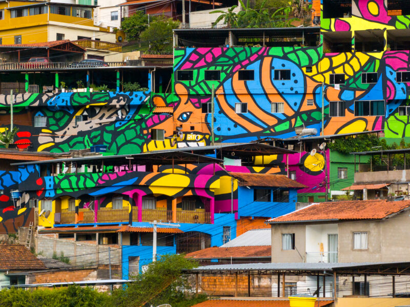 Nova Lima, città-satellite di Belo Horizonte, capitale del Minas Gerais, è una delle più ricche del Brasile per la sua storia di polo estrattivo di oro e ferro e, allo stesso tempo – come tutte le metropoli brasiliane, non si sottrae al problema della disparità sociale, con intere aree di occupate da abitazioni popolari e comunità. Ed è in questo scenario che il collettivo MAHKU (Movimento dos Artistas Huni Kuin), formato da artisti dello stato dell’Acre, appartenenti al popolo indigeno Huni Kuin (noto anche come Kaxinawá) e formalizzatosi circa quindici anni fa, ha lavorato a CURA Macro, attualmente il più grande murale del Brasile.