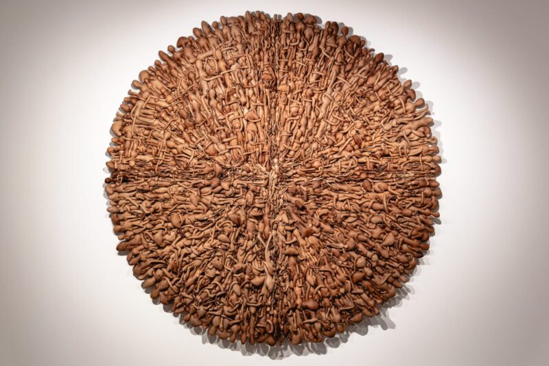 A pochi capannoni di distanza ha da poco aperto anche una sede pop-up della galleria ATHR, dal 2019 radicata a Jeddah e una delle più internazionali del Medio Oriente. Per quest’occasione, in scena, la ricerca dell’artista saudita Zahrah Alghamdi, celebre per le sue installazioni site-specific che si espandono fluide, indagando memoria e storia attraverso l’architettura e l’utilizzo di materiali tradizionali, come argilla, ciottoli, cuoio, che vengono sempre assemblati in contesti site specific…”Between Memory and Matter” è l’esempio perfetto della pratica dell’artista, che partendo dalla propria eredità personale ci restituisce una “memoria incarnata” che non è per nulla rassicurante e che rimette al dualismo tra funzionalità e violenza, tra singolo e collettivo.