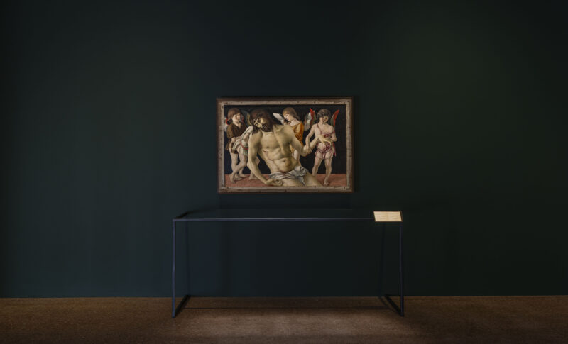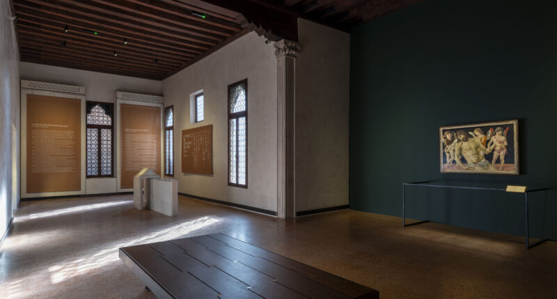 Nel buio calibrato del salone al primo piano, la Pietà spicca come si spicca dopo un viaggio importante: luce puntuale, atmosfera sacrale, quell’emozione che ti si arrampica sulla schiena quando una storia lunga secoli arriva a posarsi davanti a te. Alla sua destra, la cappella del Mantegna appena restaurata restituisce senso al dialogo: due maestri, due modi di guardare la sofferenza e la bellezza, due lenti su un’epoca che ancora oggi ci detta il respiro.