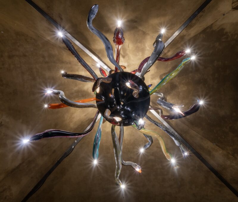 Così Simone Crestani ha deciso di far crescere un ramo fiorito dentro la struttura del lampadario, come se la natura avesse deciso di appropriarsene. Lo ha chiamato Primavera d’Oriente, e anche se nessuno lo dice, tutti ci vedono un essere vivente, qualcosa che potrebbe continuare a svilupparsi anche dopo la fine della mostra.