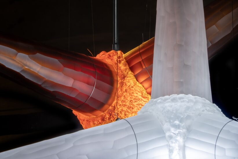 Così Simone Crestani ha deciso di far crescere un ramo fiorito dentro la struttura del lampadario, come se la natura avesse deciso di appropriarsene. Lo ha chiamato Primavera d’Oriente, e anche se nessuno lo dice, tutti ci vedono un essere vivente, qualcosa che potrebbe continuare a svilupparsi anche dopo la fine della mostra.