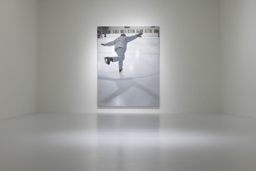 Nella Galleria milanese dipinti, tessuti e sei grandi sculture a forma di naso dalle narici marcate che sarebbero piaciute a Dalì, si susseguono in una vorticosa sequenza di opere che scardinano la linearità geometrica dello spazio white-cube con foulard, dipinti, tessuti come forma di pittura fondata su storie autobiografiche di origini ambigue, in cui anche i ricordi di vissuti personali diventano texture dell’immaginario visivo dell’artista canadese che opera all’insegna del superamento delle barriere linguistiche e visive. Il percorso espositivo incomincia sulla parete laterale del cortile interno della Galleria Giò Marconi, via Tadino 15, dove fa capolino EKS in Bed, 2022, opera a muro tratta da un ritratto fotografico della nonna Edna Katz Silver sdraiata nel suo letto, a novantatré anni, sotto un dipinto raffigurante due galli in lotta, incorniciata dalla testata in bronzo che lei stessa aveva scolpito quarant’anni prima, scattato nell’autunno del 2022 da Hommer Tayarin, amico d’infanzia e vicino di casa di Edna, ipnotica per la dignità della vecchiaia di una donna – icona per sua nipote che in questa immagine sembra sfidare la vita, la malattia e la morte. All’interno, nel mezzo del percorso espositivo vicino alla porta in vetro allarmata affacciata sul cortile interno al piano terra della galleria, fagocita lo sguardo Elevator V (20025) un grande dipinto (200.5x170x3.7 cm), che riproduce oggettivamente l’ascensore illuminato da un neon abbacinante, e qui guardando con attenzione i dettagli avrete l’impressione di superare la bidimensionalità per toccare con gli occhi una apparente tridimensionalità dell’opera pittorica con l’illusione di varcare la soglia oltre i limiti fisici di uno spazio intangibile disegnato da una luce fredda sospesa e metafisica.