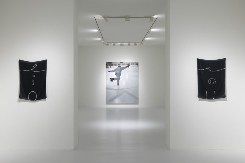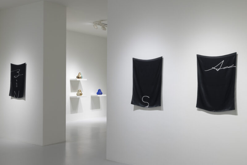L’artista esplora le sue radici, le fondamenta che includono i corpi delle persone amate che non ci sono più senza rappresentarli, per dare forma a questa mostra di un autoritratto sui generis costruito da altri. Comprende una serie di ricami di Edna Katz Silver, opere variopinte della nonna impresse nella memoria di Allison, che rappresentano una parte integrante dell’esposizione milanese. Come ha dichiarato l’artista: “Ho invitato mia nonna Edna a condividere con me questa mostra personale. È stato un modo per realizzare uno scambio reciproco iniziato quasi dieci anni fa, quando per la prima volta le chiesi di realizzare una composizione di mezzo punto basata sulla mia firma”. Infatti il nome Katz è il motivo ricorrente della mostra, un segno grafico dilatato e storpiato qua e là che apre lo sguardo sulla possibilità di indagare tratti del passato biografico dell’artista con intrecci arabescati tra vita e arte. Per Allison Katz la cornice, come l’ornamento, rappresentano gli elementi pittorici che vanno oltre il limite del quadro, anche là dove il decoro si concentra ai margini o sui bordi dell’opera. Sono rigorose ma dinamiche le opere con divagazioni segniche rivelatorie realizzate su supporti di seta e materiali acrilici nero pece, quasi foulard; dove tutto è movimento e contrappunto tra vuoto e pieno, cornice e ornamento, espedienti visivi che svelano forme rigenerative dall’immediato impatto grafico.