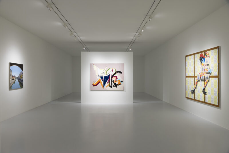 Al primo piano incantano i foulard di seta realizzati dall’azienda Bellotti fondata nel 1940 a Como da Piero Bellotti (1911-1985), il nonno materno, inizialmente conosciuta con il nome di ‘Bell’. L’impresa operava come rete di filatori, tessitori e disegnatori indipendenti, riuniti per dare forma all’ispirata visione creativa di Pietro Bellotti, conosciuto per la produzione di accessori di alta moda, in particolare foulard e sciarpe. Allison Katz s’innesta magicamente nelle trame di vita di Giò Marconi, scegliendo la serie di foulard di motivi architettonici, animali o arabeschi simili alla sua produzione iconografica, presentati come autentiche opere pittoriche, con l’obiettivo di intrecciare relazioni sulle storie autobiografiche dell’artista con quelle del gallerista milanese con trame ricorrenti nella produzione dell’artista canadese; segni che custodiscono frammenti della sua storia personale in cui ornamento, decorazione e spazio architettonico culminano in una visione di una pittura altra che comprende ago, filo, il cucire il rammendare della nonna, con l’idea di una pittura incentrata sulla non linearità del tempo, come prassi del saper guardare oltre la cornice a prescindere dallo strumento espressivo per afferrare un aspetto inconoscibile dell’inconscio senza retorica o sentimentalismi nostalgici.