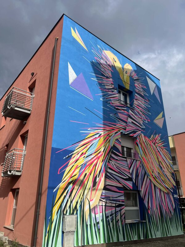 “Ho l’abitudine di lavorare in molte città diverse in tutto il mondo ed è sempre una nuova sfida arrivare in un luogo che non conosco“, racconta DACO, artista con oltre vent’anni di esperienza formatosi alle Beaux-Arts di Nantes. “In questo quartiere di Terni, la relazione con le persone è stata superba dall’inizio. Metto molti colori per sfumare i muri che sono spesso un po’ tristi e questo fa bene alle persone“.
