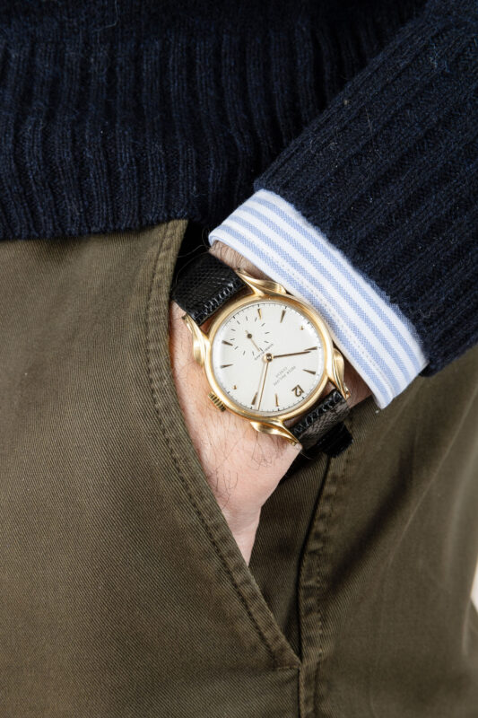 Di notevole interesse storico è il lotto 179, un Patek Philippe Calatrava ref. 2431 “Anse a Fiamma”, firmato Gobbi Milano e databile al 1950 circa. La cassa, realizzata dal celebre produttore Vichet, presenta le iconiche “Flame Lugs” mai lucidate, mentre il quadrante reca la rara doppia firma “Gobbi Milano”. Questo Calatrava incarna l’eleganza e la maestria artigianale di Patek Philippe nel dopoguerra (stima: € 10.000 – 20.000).