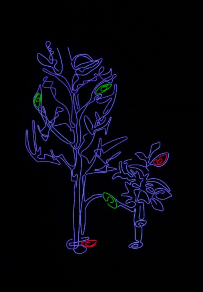 Proprio da questa filosofia nasce il nuovo progetto luminoso allestito in Via Valle Cicala. Tre immagini simboliche dialogano con le architetture circostanti e con i colori identitari di Pulsee Luce e Gas. La sagoma di uno dei cavalletti presenti ad ARTEPARCO, evocazione di Specchi Angelici, accompagnata da un piccolo cavallo e da un occhio. Una mano che stringe un fiore di genziana, pianta tipica del territorio abruzzese, che a sua volta ci osserva. Un albero di occhi ai cui piedi si staglia una figura umana, metafora dell’armonia che nasce dal dialogo con la natura.