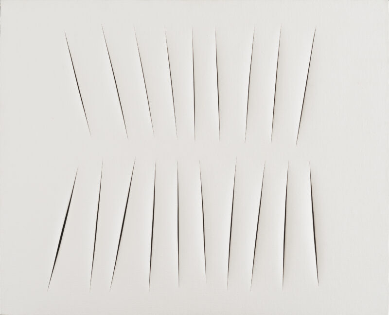 Il percorso espositivo si apre con la sezione dedicata a Lucio Fontana, didascalica ma necessaria: è il padre del Primo Manifesto Spazialista (1947), con Beniamino Joppolo, Giorgio Kaisserlian, Milena Milani, un movimento innovativo sostenuto dalla Galleria del Cavallino a Venezia, rivoluzionario a partire dalle sue tele “dipinte” prima con buchi in cui il vuoto comincia a diventare l’elemento costitutivo di un nuovo spazio cosmico, e dal 1958 con i tagli: gesti irruenti sulla tela che introducono nell’arte “Concetti spaziali”, opere monocrome chiamate Attese, che ruotano intorno alla tridimensionalità della pittura.