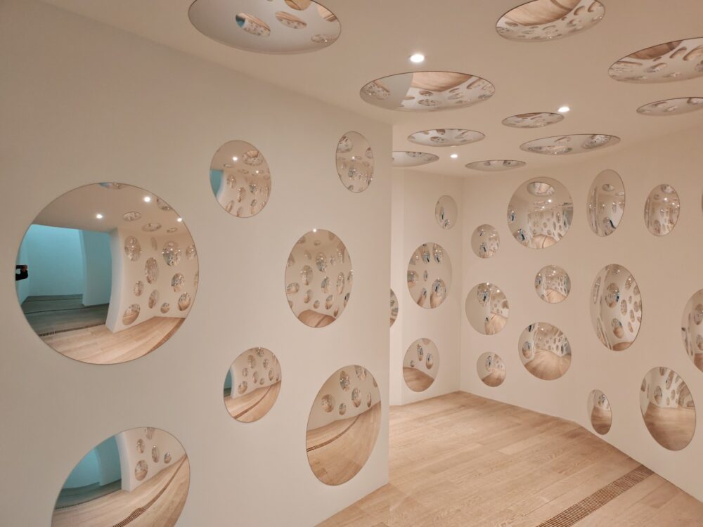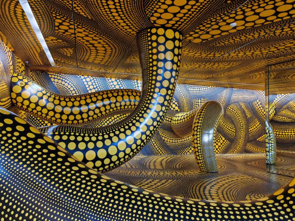 La ripetizione, gesto fondante della sua poetica, assume qui il valore di un rito, un tentativo di dissolvere il confine tra soggetto e mondo. Le Infinity Mirror Rooms rappresentano il fulcro emotivo della mostra. In questi ambienti, lo spettatore è chiamato a perdere i propri riferimenti, a farsi parte di un campo visivo in continua espansione. L’effetto non è soltanto spettacolare: il moltiplicarsi dei riflessi mette in crisi l’idea stessa di identità, suggerendo una condizione di vulnerabilità condivisa.