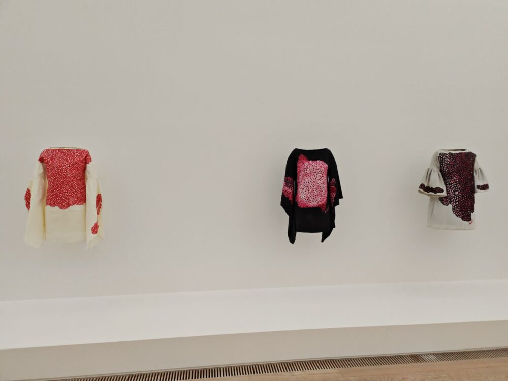 Non si tratta di un semplice elemento decorativo: per Kusama il pois nasce come manifestazione visiva di allucinazioni precoci. Esperienze percettive in cui il mondo le appariva ricoperto da macchie, reticoli, proliferazioni senza fine. Il corpo materno, primo soggetto di questa visione, diventa così uno spazio su cui il segno si deposita, segnando un intreccio profondo tra sfera intima e immaginario formale.
