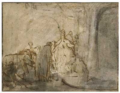 Questa piccola ma intensa composizione-studio di Rembrandt van Rijn rappresenta un passo cruciale nel tortuoso processo creativo attraverso cui il giovane artista giunge alla composizione finale del dipinto omonimo. Iniziato nel 1628 quando l’artista aveva 22 anni, l’opera finita resta una delle sue prime opere storiche più ambiziose e la prima a mostrare la peculiarità della luce nella composizione e nella narrativa che caratterizza il suo stile iconografico. Il disegno non è mai stato visto da studiosi per almeno mezzo secolo, è il primo disegno di scena storica di Rembrandt che arriva sul mercato dopo decenni.