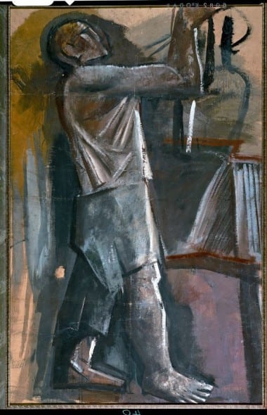 Per lui il fascismo significava la rinascita dell’Italia, della sua arte, il superamento del quadro come oggetto privato e “andare verso il popolo” (Mussolini), ovvero verso un’arte pubblica: «il muro non è una tela deve avere una funzione sociale», sui muri sono espressi i valori di famiglia, patria, cultura, lavoro e giustizia. L’arte «deve produrre l’etica del nostro tempo» (Sironi, il Manifesto della pittura murale, 1933). Gli vengono commissionate grandi opere murali: l’Italia tra le Arti e le Scienze (1935), affresco per l’Aula Magna dell’Università di Roma (costruita da Piacentini); L’Italia Corporativa (1936), mosaico per la VI Triennale milanese; gli affreschi per la Casa Madre di Mutilati di Guerra accanto a Castel Sant’Angelo e La Carta del Lavoro (1932), vetrata di 75 mq., che celebra il documento della riforma del lavoro e orna lo scalone d’onore dell’attuale Ministero delle Attività Produttive (progettato da Piacentini) in via Veneto. Sulla vetrata, i cui i cartoni preparatori sono presenti in mostra, sono raffigurati: il lavoro, le arti e i mestieri. L’opera sarà visitabile dopo i lavori (supportati da Acea) di pulitura e consolidamento che inizieranno nei prossimi giorni. L’umanità sofferente di Mario Sironi assurge a un carattere di sacralità nell’assolvimento del proprio dovere: il lavoro.