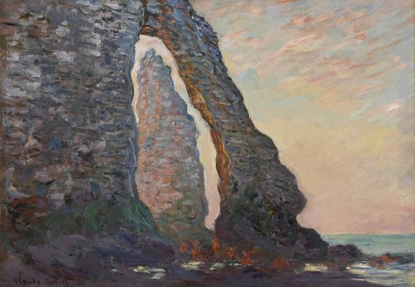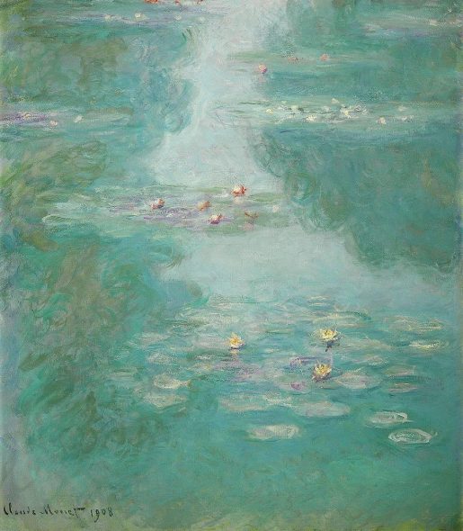 Comincia in questi anni la modernizzazione della pittura, ma fu poco apprezzata al punto che i collezionisti americani chiedevano espressamente che i quadri fossero rifiniti a dovere, considerando l’incompiutezza di Monet come una mancanza di qualità dell’opera. Ciò fu motivo di bonaria discussione con il gallerista Durand-Ruel, che faticava non poco a vendere le sue opere. “Scogliera a Porte d’Amont” ben illustra il nuovo corso del pittore, con l’ampia e rapida pennellata che traccia appena la roccia e affida al solo cambio cromatico la distinzione fra terra, mare e cielo. Questo stile, che nel Novecento si ritroverà nell’informale e nell’espressionismo astratto, all’epoca era, per i più, inconcepibile. La vena sperimentatrice di Monet non si fermò qui e per le serie dedicate alla falesie normanne, o alla valle della Creuse nella Francia centrale, si può parlare di pittura espressionista: ancora lo studio della luce nelle differenti ore del giorno, ma con un tratto pittorico che, attraverso il colore, accentua la tridimensionalità dei volumi, anche grazie alla consueta prospettiva schiacciata di stampo giapponese e a una più compatta stratificazione di pennellate che saturano la tela. A questo proposito, anche gli studi sulla Cattedrale di Rouen, nelle varie ore del giorno, costituiscono uno dei punti più alti della pittura di Claude Monet, con la pennellata eterea che sembra elevare ancor di più le slanciate forme gotiche dell’edificio sacro; o ancora, tra la fine del secolo e l’inizio del successivo, le nebbiose vedute londinesi, con il Tamigi protagonista di straordinari effetti pittorici che precorrono l’espressionismo astratto degli anni Cinquanta. Eppure, anche molti suoi colleghi, fra cui Renoir e Pissarro, non espressero commenti favorevoli. Incurante di ciò, dal buen retiro di Giverny – la tenuta che già nel 1883 aveva affittato e che sette anni più tardi riuscirà ad acquistare -, Monet spostò ancora avanti la lancetta dell’arte, partendo dalle celeberrime ninfee e dal giardino che circondava la casa. In queste opere, straordinariamente moderne e che avrebbero potuto essere state dipinte anche solo pochi anni fa, Monet fu il primo pittore a “liberare il segno”, anticipando di decenni le intuizioni di artisti quali Jackson Pollock, Mark Rothko e Cy Twombly. Protagonista assoluto è il colore, che suggerisce la presenza di paesaggi, fiori, piante, acqua sfrangiando però il quadro compositivo tradizionale e aprendo la strada all’arte concettuale della percezione allargata.